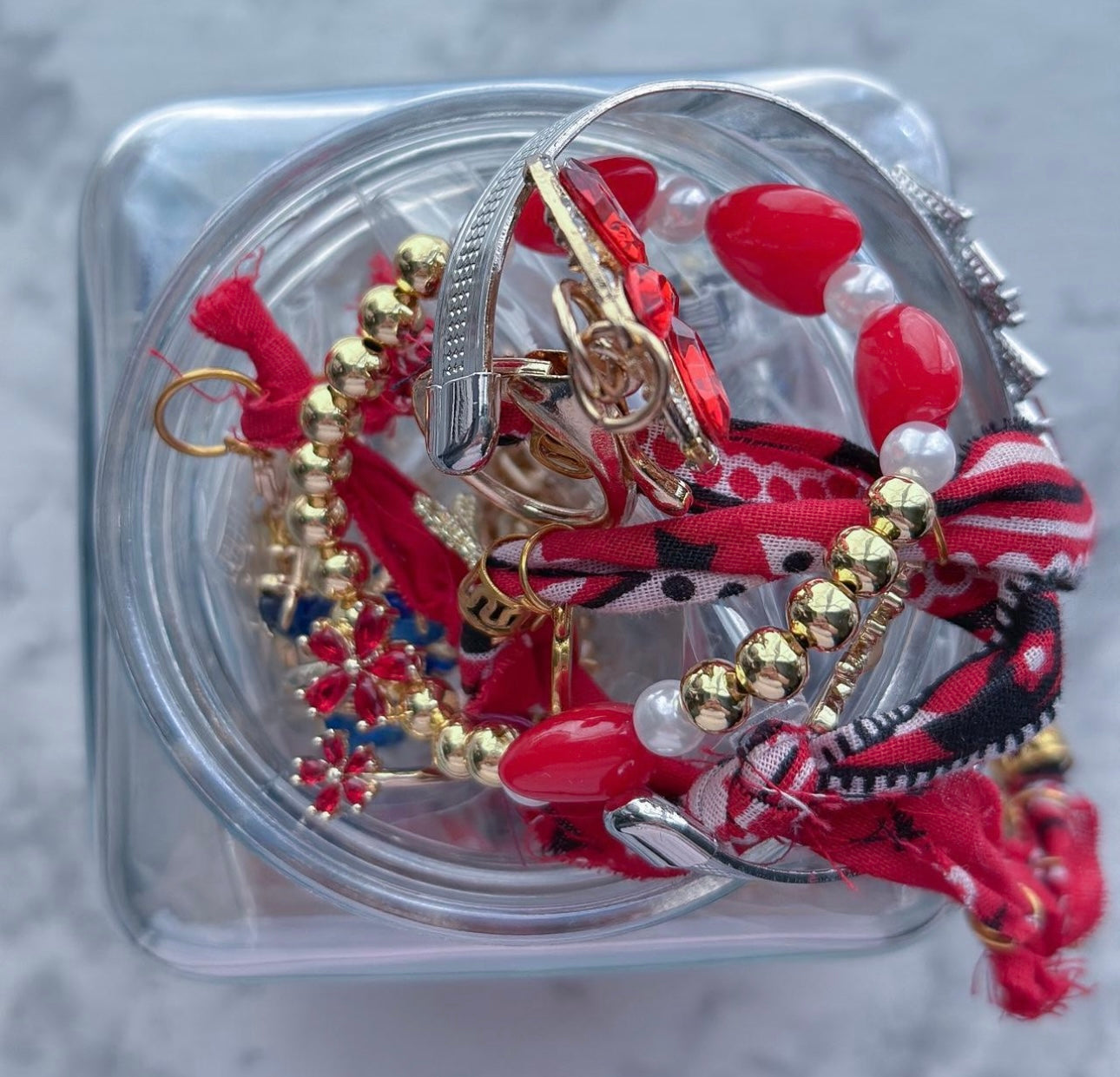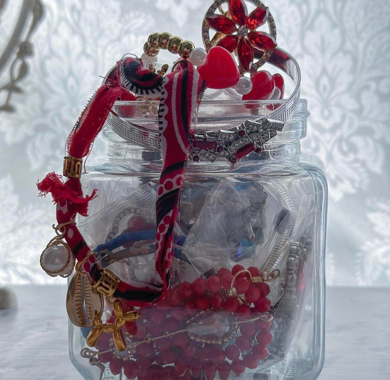 Red & blue jewelry bundle includes Mostly earrings with a few necklace and some bracelets and rings. Some pieces are brand new. Most pieces are fashion pieces. (Will not ship in jar)